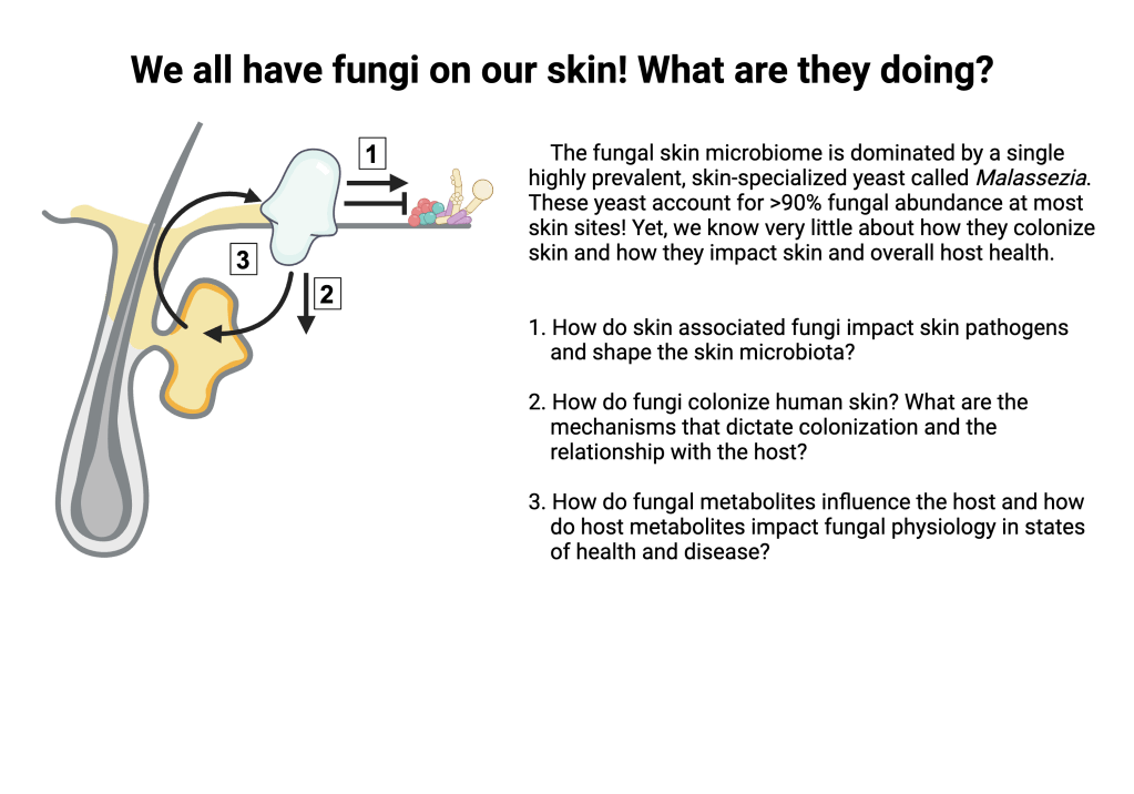 My lab will build off my postdoc work (bioRxiv) describing the ability of skin-resident Malassezia yeasts to kill the prominent skin pathogen Staphylococcus aureus. With my expertise in fungal biology, microbial genetics, and various host models, my group will investigate the mechanisms that facilitate skin colonization by Malassezia, and how interactions between Malassezia, the host, and the microbiota/pathogens impact skin health.